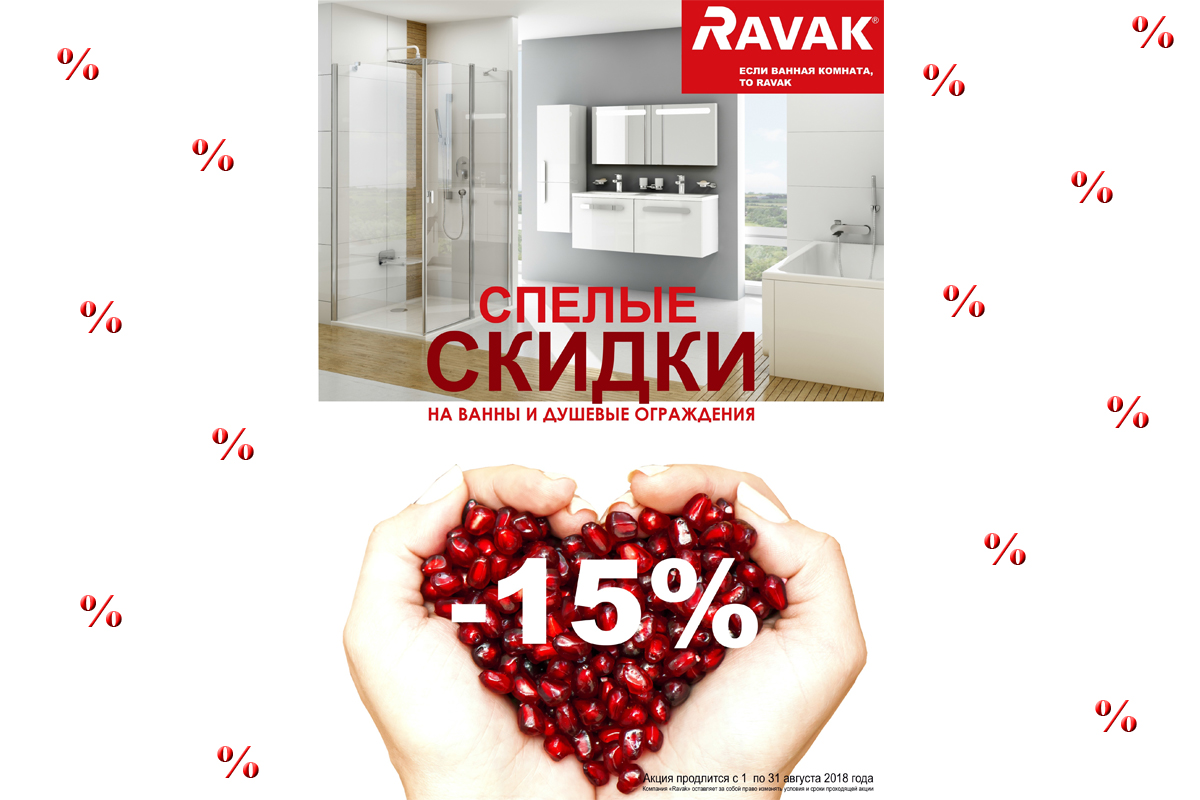 Рекламная акция "Спелые скидки". Только с 01 по 31 августа специальная скидка 15% на все душевые ограждения и ванны Ravak.